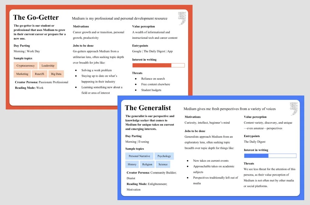 This research leveled up two primary personas: The go-getter—our student or professional that uses Medium to grow or stay relevant in their current career or prepare for a new one—and the generalist—our perspective and knowledge seeker. While the former comes to Medium from a utilitarian lens and goes deep on a given topic (e.g. data science, cryptocurrency), the latter approaches the platform exploratorily; seeking topic breadth and new perspectives.
